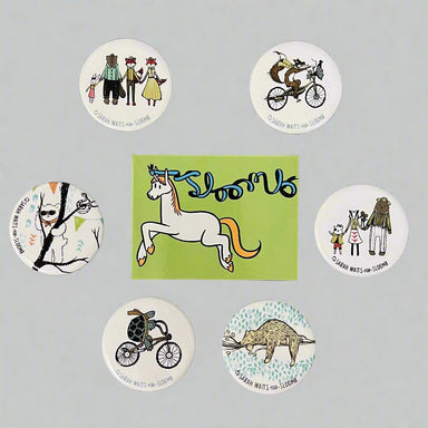 Sarah Watts for Sloomb magnets (artwork by Sarah Watts) Sloombicorn magnets (artwork by Lucy Knisley) (green background).