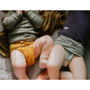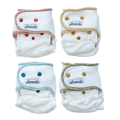 Sloomb's multi-size cloth diaper. Heavy bamboo|organic cotton terry body with comfortable turned and topstitched leg elastic. Includes 3-layer bamb...