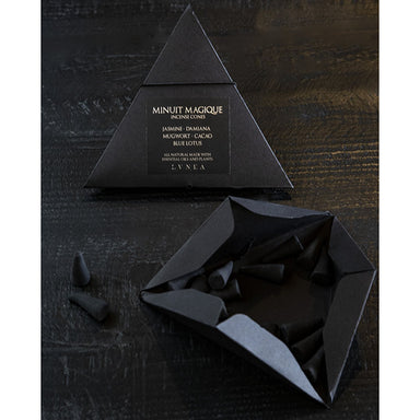 Minuit Magique - Incense cones Featured Notes: jasmine, damiana, mugwort, cacao, blue lotus Aspects: strong floral, powdery Limited Edition natur...