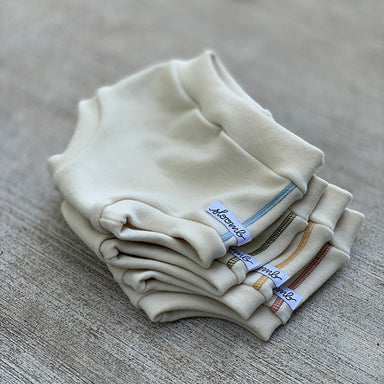 Natural interlock wool covers with contract stitching. Sloomb undyed interlock wool covers are a great day/play weight wool cloth diaper cover opti...